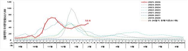 13일 질병관리청에서 운영 중인 의원급 의료기관 표본감시 결과에 따르면 인플루엔자 의사환자 분율(인플루엔자 등 감염병 의심 증상으로 치료받은 환자 수)는 2월 첫 째주(1~7일)에 외래환자 1000명당 52.6명으로 집계됐다. 전주(47.5명) 대비 증가했으며 이번 절기 유행기준(9.1명)보다 높은 수준의 유행이 지속되고 있다.