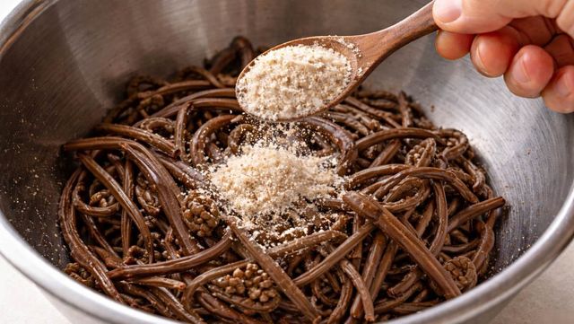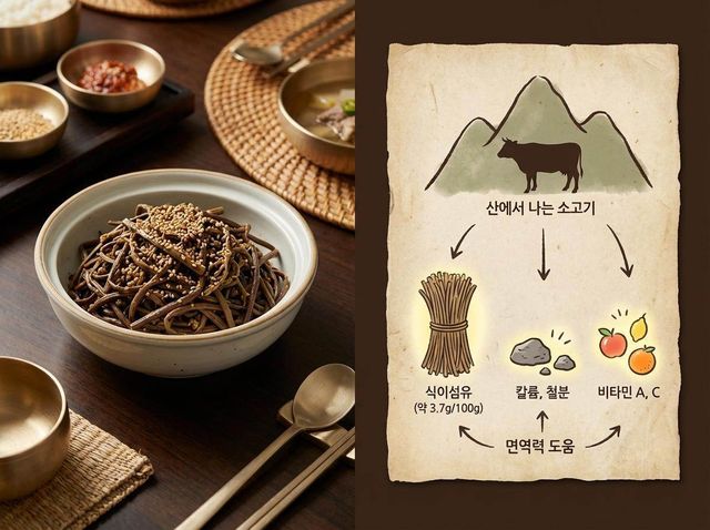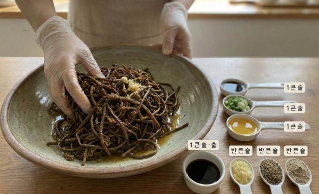 여기서 결정적 차이를 만든 재료가 바로 '메밀가루' 반 큰술이다. 고사리는 다른 나물보다 특유의 비린 향이 강해 오래 볶는 경우가 많은데, 메밀가루가 들어가면 조직을 부드럽게 하고 잡내를 잡아주면서 감칠맛을 더해준다. 너무 많이 넣으면 끈적해질 수 있어 반 큰술이 적정량이다.