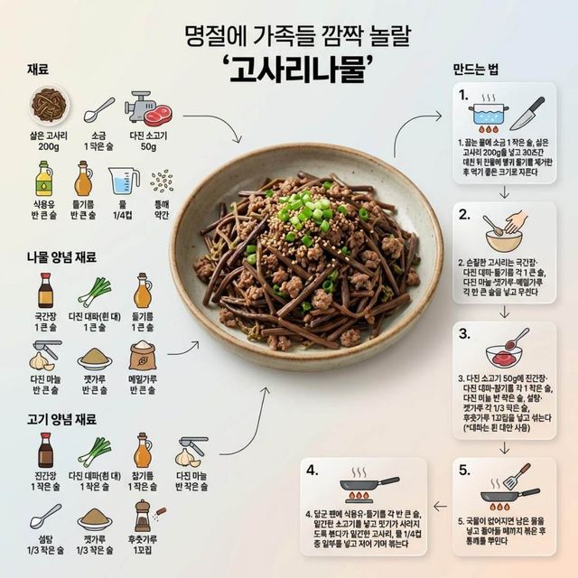 명절 차례상과 손님상에서 빠지지 않는 삼색나물 가운데, 고사리는 유독 까다로운 음식으로 꼽힌다. 비린 향이 남기 쉽고, 덜 볶으면 간이 속까지 배지 않으며, 오래 볶으면 질겨지기 때문이다. 이런 이유로 기본 중의 기본인 나물이지만 많은 가정에서 실패를 반복해 왔다.