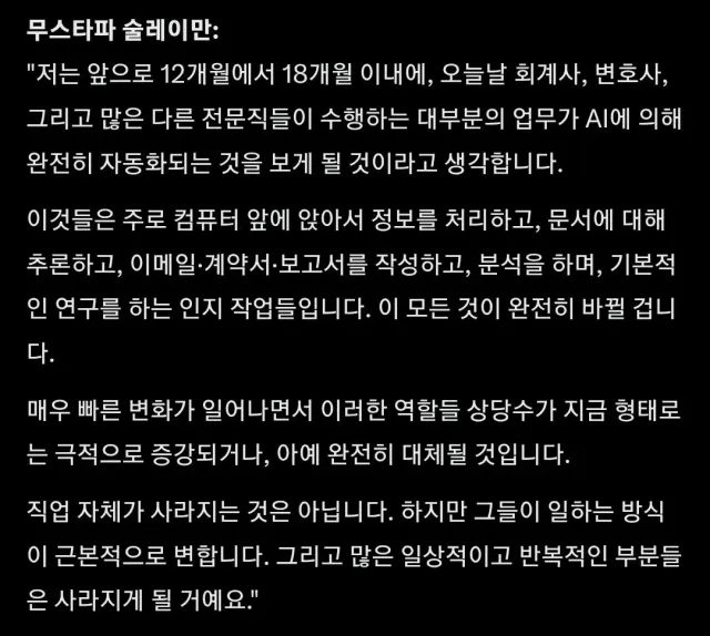 오늘 마이크로소프트 AI CEO가 회계사,변호사 업무는 완전히 바뀔거라고 함