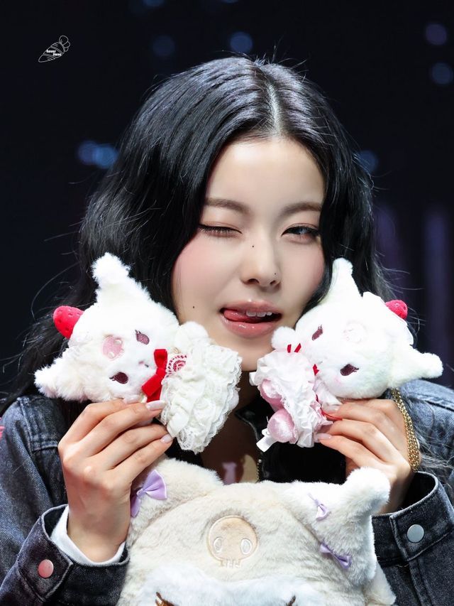 액세서리는 규진의 장난기 가득한 매력을 극대화하는 아이템들로 구성되었습니다. 머리 위에는 핑크색 안감이 돋보이는 블랙 퍼 고양이 귀 머리띠를 착용하였으며, 양손에는 핑크색 발바닥 패드(젤리)가 선명한 커다란 블랙 털장갑을 끼어 완벽한 '흑고양이' 테마를 완성했습니다. 이러한 키치한 소품들은 그녀의 작은 얼굴과 대비되어 더욱 사랑스러운 분위기를 자아냅니다.