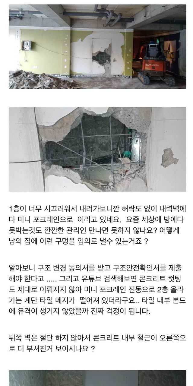 울산의 한 원룸 건물주인 작성자 A씨는 최근 1층에서 들려오는 극심한 소음과 진동에 내려갔다가 믿기 힘든 광경을 목격했습니다. 1층 임차인이 건물주의 허락도 없이 미니 포크레인을 동원하여 건물의 하중을 지탱하는 '내력벽'에 커다란 구멍을 내고 있었기 때문입니다. 사진 속 현장은 콘크리트 절단(컷팅) 작업조차 제대로 이뤄지지 않아 내부 철근이 흉측하게 노출되고 벽면이 거칠게 부서진 상태였습니다.
