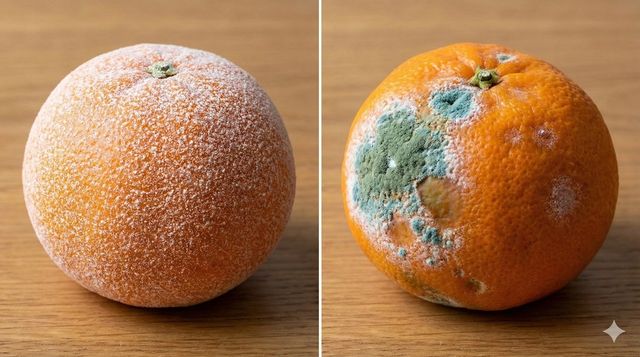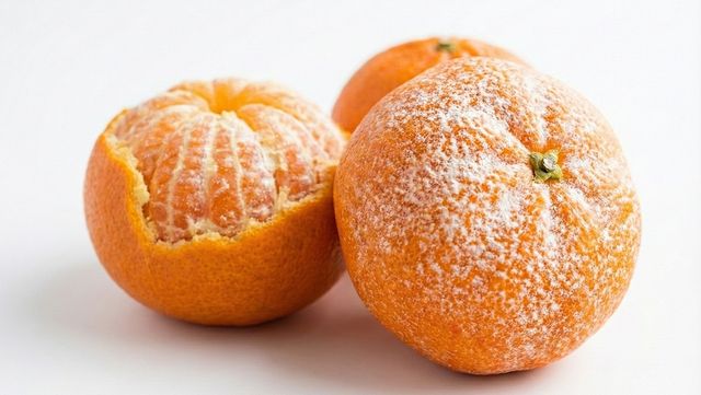 상한 귤에 생긴 곰팡이라면 즉시 버려야 하지만, 고르게 묻어 있는 하얀 가루는 칼슘제일 가능성이 높다.