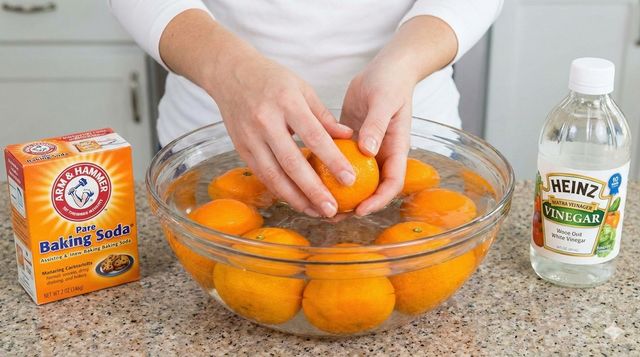 베이킹소다와 식초를 활용한 귤 세척 / AI 생성 이미지