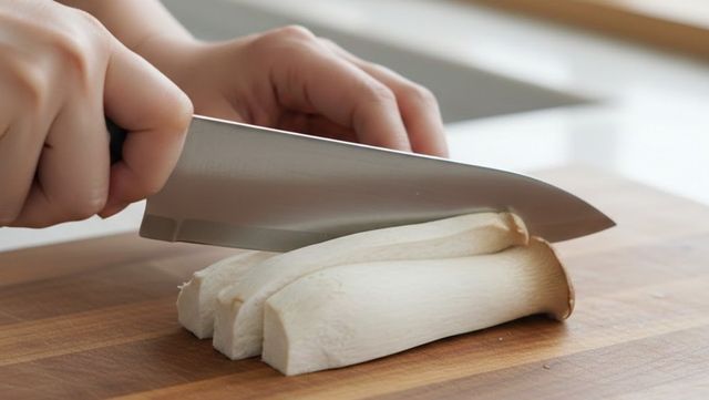 새송이버섯을 길게 자르는 모습. AI가 생성한 자료사진.