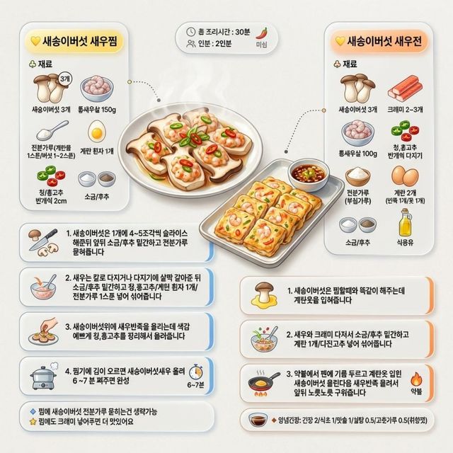 이 레시피는 동일한 기초 재료를 바탕으로 담백한 '찜'과 고소한 '전'을 동시에 구현할 수 있어 활용도가 높다. 특히 새송이버섯의 식감과 새우의 감칠맛이 어우러져 명절 상차림에 어울리는 이색적인 별미가 된다.