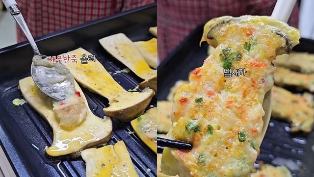 새송이버섯에 계란물을 묻혀 새우반죽을 올리고 구운 모습. / 유튜브 'JJinjubu 찐주부'