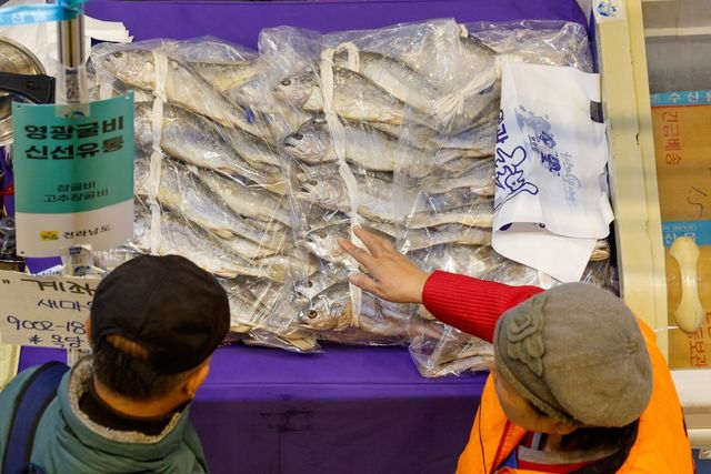 시민들이 굴비를 살펴보고 있다 뉴스1