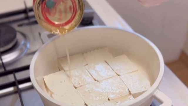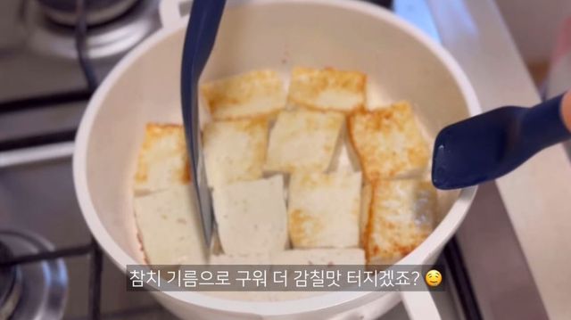 참치 기름을 넣은 두부를 굽는 모습. / 유튜브 '딜리팟dillypot'