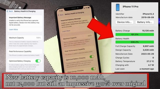 유튜브 채널 The Fix는 출시된 지 약 7년이 지난 아이폰 11 프로에 12,000mAh 배터리를 이식하는 과정을 공개했다. 참고로 아이폰 11 프로의 기본 배터리 용량은 3,046mAh였다. 이미 배터리 성능은 67%까지 저하된 상태였으며, 교체가 필요한 상황이었다. 제작자는 단순 교체 대신, 기존과 동일한 물리적 크기를 유지하는 12,000mAh 배터리를 장착했다.