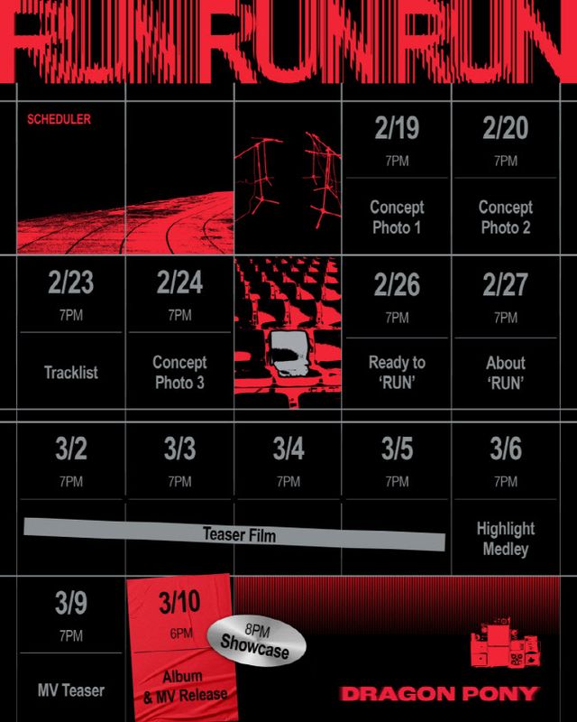 공개된 스케줄러 이미지에는 강렬한 블랙 앤 레드 톤의 조화 속에 앨범 타이틀 로고인 ‘런런런’이 등장, 타이포그래피로 강조된 파열감에서 드래곤포니가 이번 EP로 보여줄 음악적 에너지를 기대케 했다.