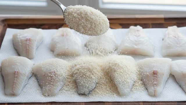 손질된 동태에 빵가루를 추가하는 모습. AI가 생성한 자료사진.