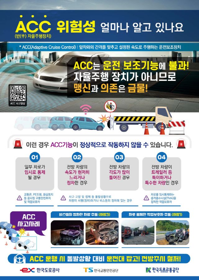 ACC는 운전자의 주행 편의성을 높여 주지만 교통정체 및 사고 등 돌발상황에 대응하지 못하고 대형 사고로 이어질 수 있다. 또 눈·비 등 악천후 상황에는 기능 작동이 제한되거나 작동하지 않을 수 있다. 기상청에 따르면 16일, 18일에 눈이 올 것으로 예상되는 만큼 각별한 주의가 필요하다.