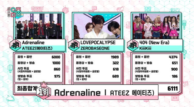 이날 에이티즈는 음원·음반 점수 6000점, 동영상·방송 점수 1000점, 사전투표(시청자위원회·글로벌) 점수 860점, 생방송 투표 점수 975점으로 총 8835점을 받으며 1위에 올랐다. 이어 2위는 키키(총 6111점), 3위는 제로베이스원(총 3618점) 순으로 집계됐다.