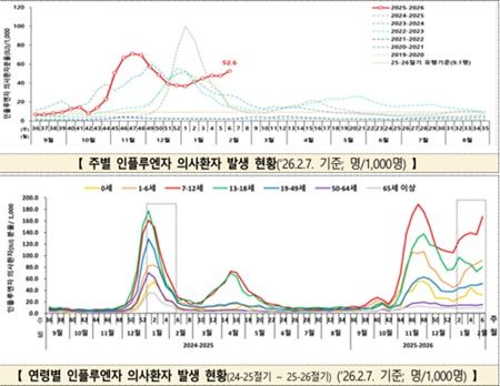 질병관리청(청장 임승관)에 따르면 2026년 6주차(2월 1~7일) 인플루엔자 의사환자 분율이 외래환자 1,000명당 52.6명으로 전주(47.5명) 대비 증가했다.