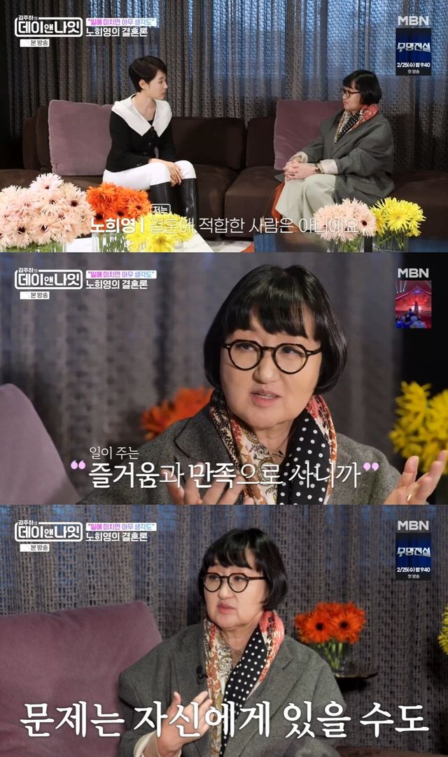 그러면서 노희영은 "저는 철저하게 제 반성을 하고 있다. 나는 결혼에 적합한 사람은 아니었다"고 자신을 돌아봤다. 이를 듣던 김주하는 "저도 오늘 밤 다시 한 번 생각해봐야겠다"고 반응해 웃음을 자아냈다.
