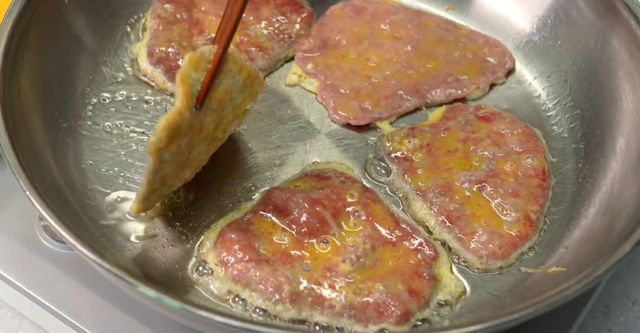 팬은 중약불에서 충분히 예열한 뒤 기름을 두른다. 불이 세면 계란이 먼저 타고 고기는 질겨진다. 반대로 불이 너무 약하면 계란물이 흘러내리며 모양이 흐트러진다. 팬에 고기를 올렸을 때 지글거리는 소리가 나되, 연기가 나지 않는 정도가 적당하다.