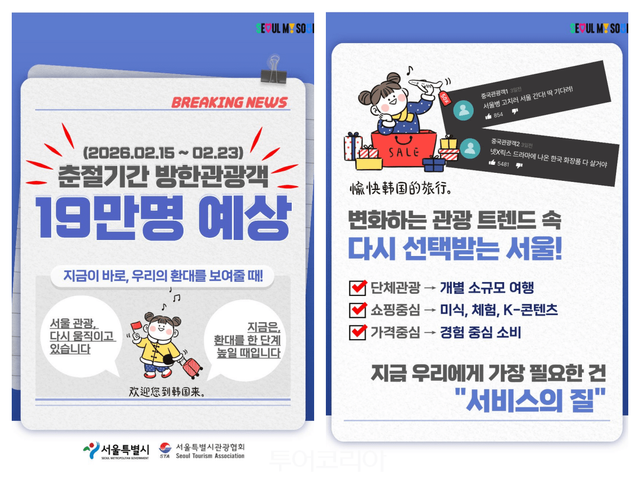 서울시와 서울관광재단도 춘절 연휴를 맞아 2월 13일부터 26일까지 2주간 ‘춘절 맞이 중국 관광객 환대 프로그램’을 가동한다.