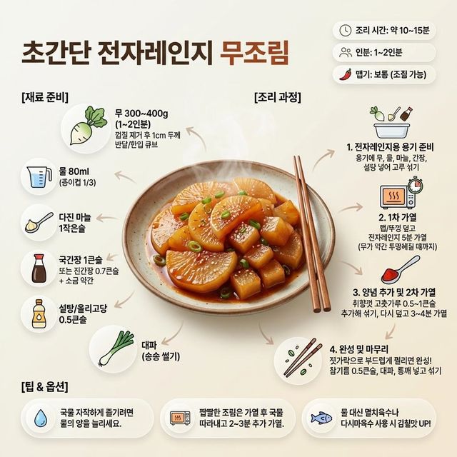 이 조리법은 별도의 불 조절이나 복잡한 과정 없이 전자레인지 가열만으로 부드러운 무조림을 만들 수 있다는 점이 특징이다.