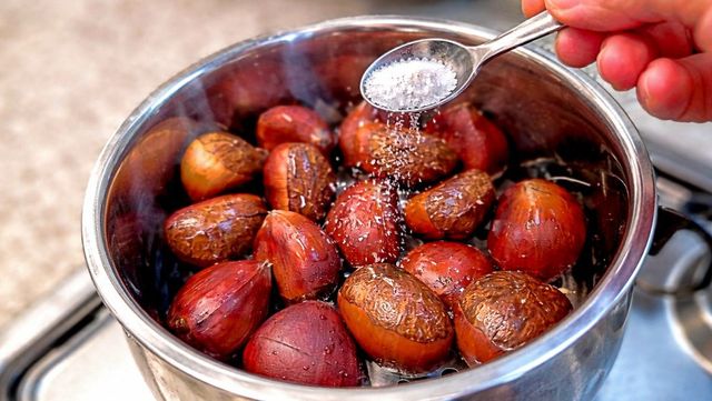 밤 삶을 때 비법 재료는 '소금'. 소금은 밤의 단맛을 극대화하고, 속껍질을 수축시켜 알맹이와 분리되도록 돕는다. 기사 내용 토대로 AI툴 활용해 제작한 자료사진.