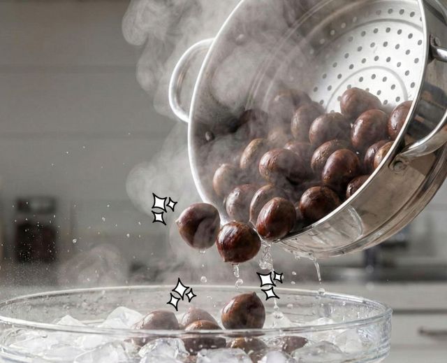 껍질을 쉽게 까는 결정적인 단계는 삶거나 찐 뒤의 처리다. 불을 끈 직후 바로 뚜껑을 열지 말고 10분 정도 뜸을 들인다. 내부까지 열이 고르게 퍼지며 수분 균형이 맞춰진다. 이후 뜨거운 밤을 곧바로 찬물에 담근다. 이 과정에서 알맹이는 급격히 식고, 속껍질은 수축하면서 겉껍질과의 사이에 틈이 생긴다. 이른바 열 충격 효과로, 손으로만 눌러도 껍질이 벗겨질 정도로 분리가 쉬워진다.