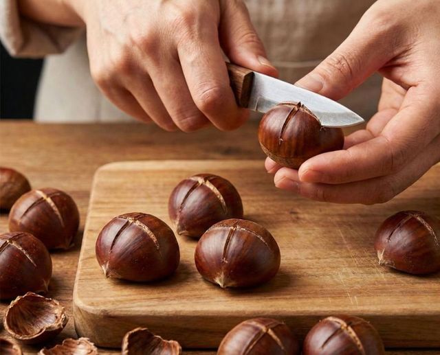 불린 밤의 윗부분에 열십자(+) 모양으로 칼집을 내주면 익으면서 껍질이 벌어져 훨씬 까기 수월해진다. 기사 내용 토대로 AI툴 활용해 제작한 자료사진.