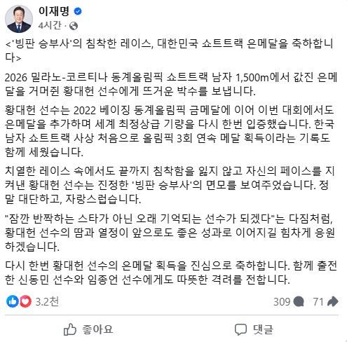 이 대통령은 페이스북 게시글에서 "2026 밀라노-코르티나 동계올림픽 쇼트트랙 남자 1500m에서 값진 은메달을 거머쥔 황대헌 선수에게 뜨거운 박수를 보냅니다"라고 축하 인사를 전했다.