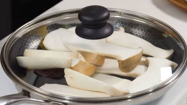 먼저 깨끗한 물에 가볍게 헹군 새송이버섯 네 송이를 준비한다. 버섯은 너무 얇지 않고 도톰하게 썰어야 씹는 맛이 산다. 팬에 버섯을 올리고 물 두 숟가락만 살짝 뿌린 뒤 뚜껑을 닫는다. 중약불에서 익히다 보면 버섯 자체에서 수분이 나오는데, 이때 불을 약하게 조절한다.