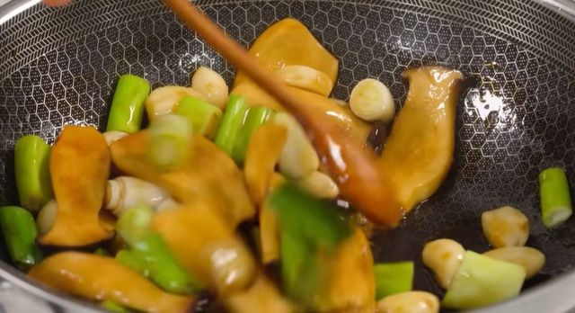 간장물이 끓어오르면 통마늘을 먼저 넣고 썰어둔 버섯을 투하한다. 국물이 짜박짜박하게 줄어들 때까지 충분히 졸여주는 것이 포인트다. 국물이 거의 다 줄어들었을 때 대파를 넣는다. 대파를 너무 일찍 넣으면 푹 물러서 맛이 없으므로, 마지막에 넣어 아삭한 식감을 살려야 한다.