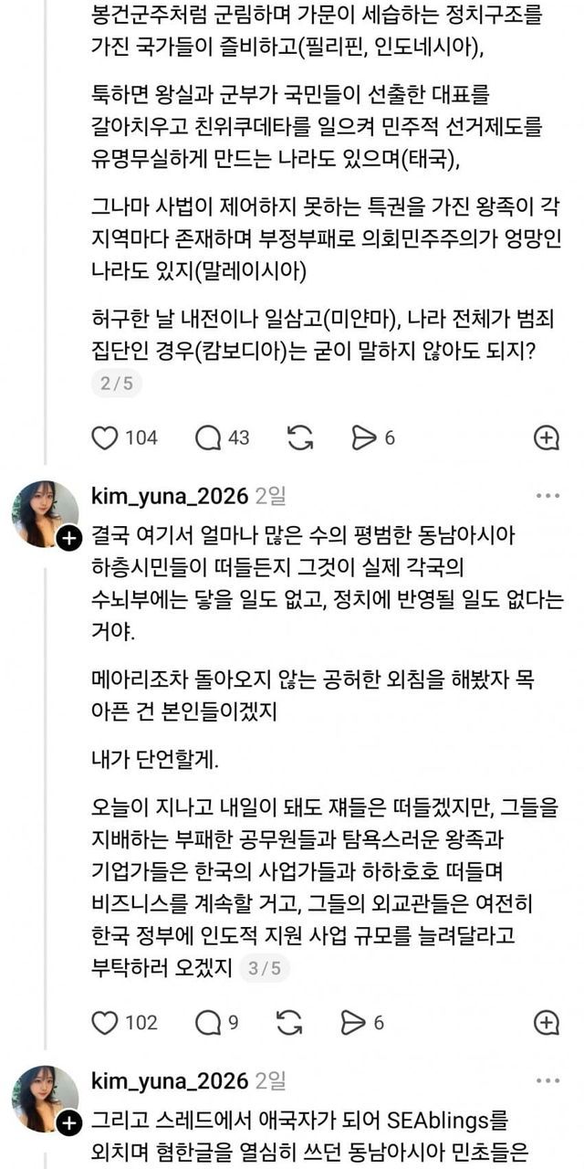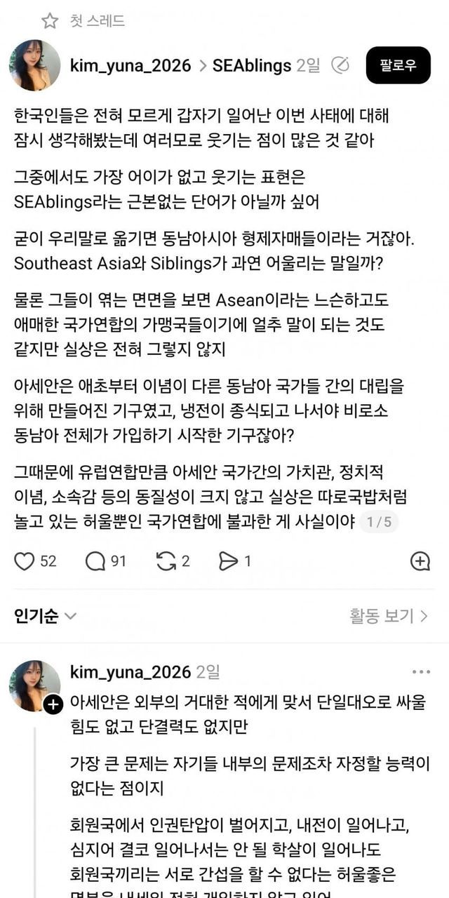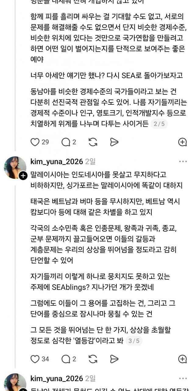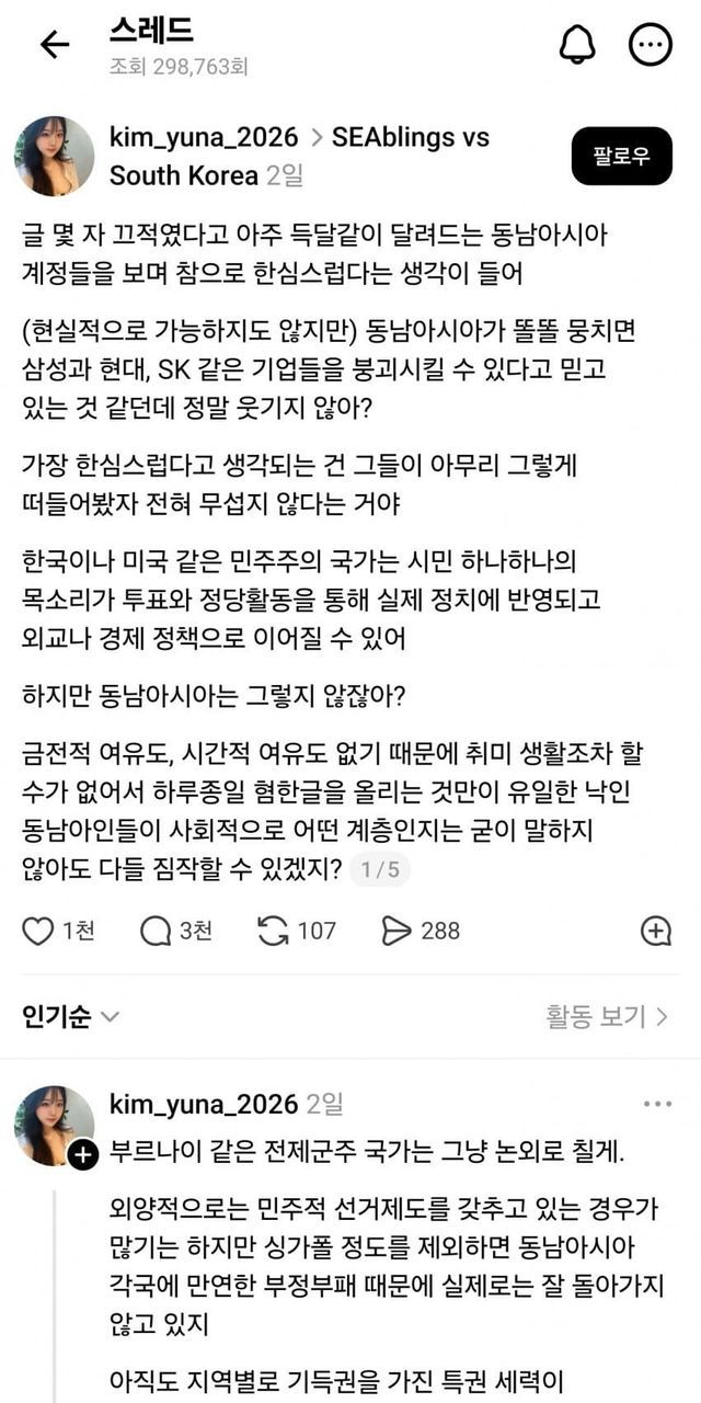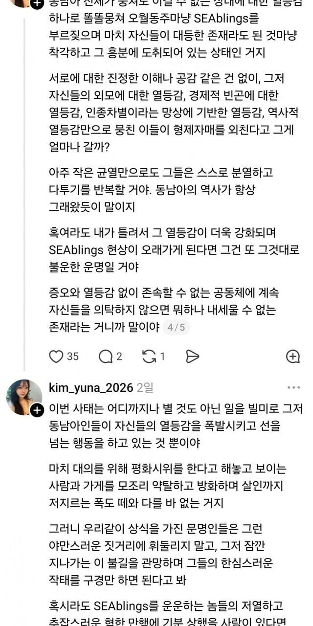 SEAbling이라는 단어에 대해 그냥 자기 생각을 썼더니 동남아 애들이 지랄해서 아까 본 글(국민주권)을 쓴 거고