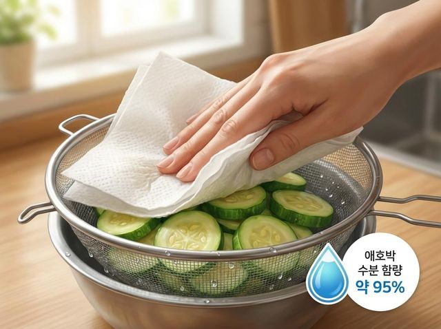 건져낸 애호박은 체에 밭쳐 물기를 털어낸 뒤 키친타월로 한 번 더 눌러 수분을 최대한 제거한다. 이 단계가 빠지면 팬에 올렸을 때 다시 물이 배어 나온다. 충분히 식힌 뒤 부침 과정을 진행한다. 기사 내용 토대로 AI툴 활용해 제작한 자료사진.