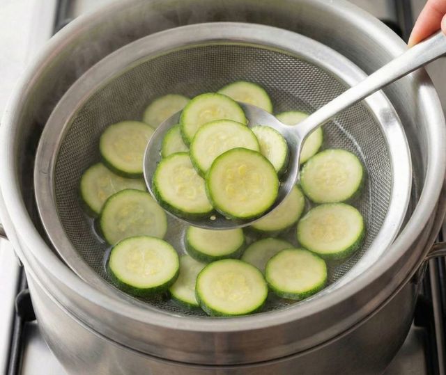 팬에 올리기 전, 애호박을 소금물에 짧게 데치는 과정. 기사 내용 토대로 AI툴 활용해 제작한 자료사진.