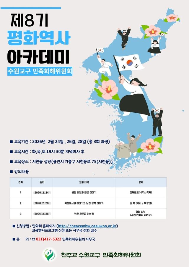 24일에는 역사학자 김재원 교수가 '분단 과정과 전쟁이야기', 26일에는 북향민 김혁 박사가 '북한에서의 이야기와 남한 정착 이야기', 28일에는 수원 민화위 위원장 허현 신부가 '북한 천주교 이야기'를 주제로 강의를 펼칠 예정이다.