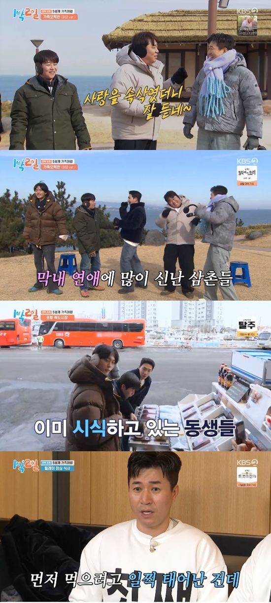 15일 방송된 KBS 2TV '1박 2일 시즌4'에서는 김종민, 문세윤, 이준, 딘딘, 유선호가 경북 포항에서 5형제 가족여행에 나서는 모습이 전파를 탔다.