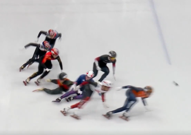 1500m는 111.11m 링크를 13바퀴 반 돌아 승자를 가리는 종목인데 4바퀴를 남겨놓은 시점에서 3위를 달리고 있던 나이얼 트레이시(영국)가 곡선 주로 진입 시점에서 넘어졌는데 바로 뒤에 있는 류샤오앙(중국)이 트레이시를 피하지 못하고 같이 넘어진 것이다.