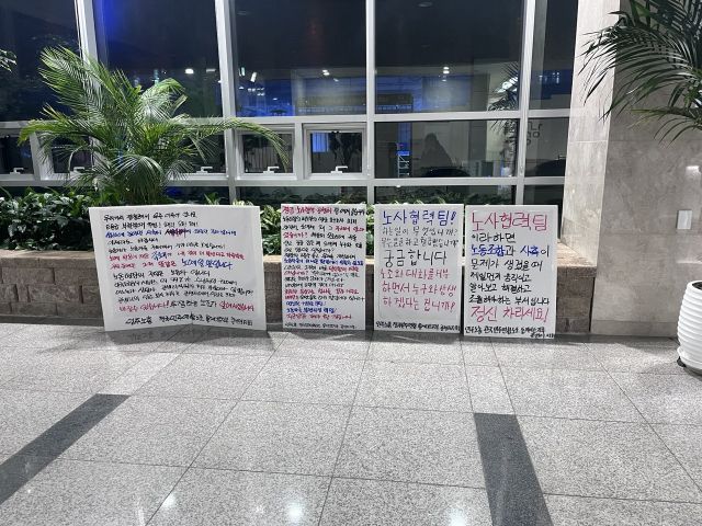노조 활동은 대부분 퇴근 후에 이뤄진다. 구호를 연습하고, 피켓 문구를 고민하며, 8박자 구호도 맞춰본다. 대부분 박순향 지부장에게 영상을 보내 조언을 받는다. 조합 활동 얘기가 나오면 조합원들의 얼굴에선 웃음기가 돈다.