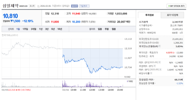 Samil Pharmaceutical closed at 10,810 won, down 12.19% from the previous trading day, fueled by heavy selling from foreign investors on the 6th. Volatility peaked as the price dipped as low as 10,200 won during intraday trading.