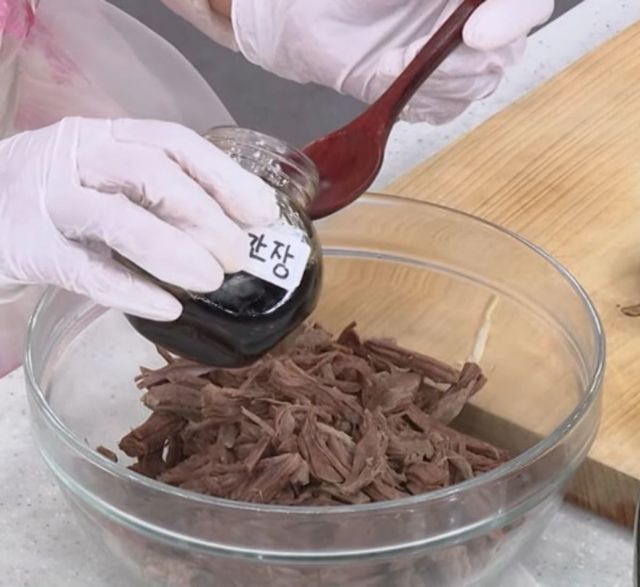 찢은 고기는 다진 대파, 참기름, 고춧가루, 조선간장으로 밑간한다. 이때 사용한 간장은 직접 담근 조선간장으로, 일반 양조간장보다 염도가 높아 소량만 넣는다. 육수 역시 조선간장과 굵은 소금으로 간을 맞춘다. 간장을 과하게 쓰면 색이 탁해질 수 있어 주의한다.