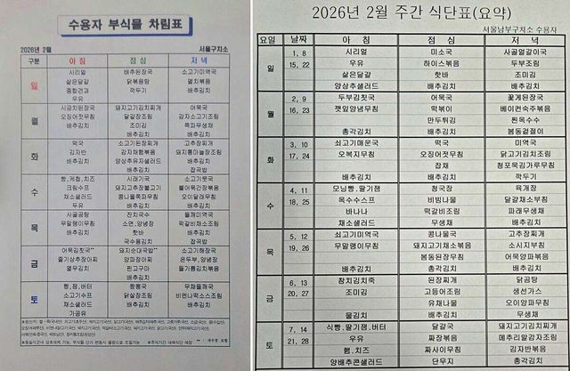 서울구치소 2월 식단표와 서울남부구치소 2월 식단표. / 법무부 제공
