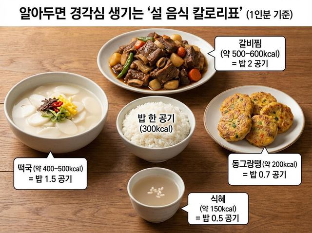 칼로리를 감각적으로 이해하는 것도 도움이 된다. 떡국 한 그릇은 밥 한 공기를 훌쩍 넘는 열량이 될 수 있고, 동그랑땡 몇 개는 밥 한 공기와 맞먹는다. 무심코 집은 전 한 접시가 하루 섭취량의 상당 부분을 채운다는 점을 인지하면 젓가락 속도가 달라진다.