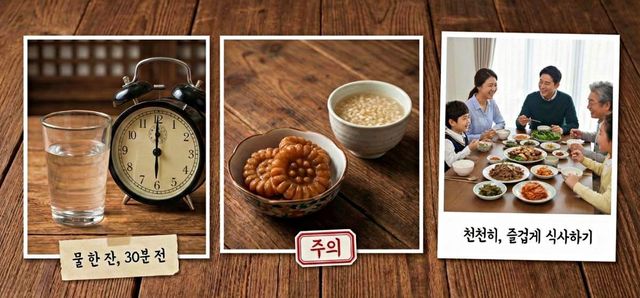 추가로 식사 20~30분 전 물 한 컵을 마시면 과식을 줄이는 데 도움이 된다. 식사 중에는 대화를 늘리고 씹는 속도를 늦추는 것이 좋다. 뇌가 포만감을 인식하는 데 시간이 필요하기 때문이다. 후식으로 나오는 식혜나 약과는 식사 직후 연달아 먹기보다 양을 정해두는 편이 낫다.