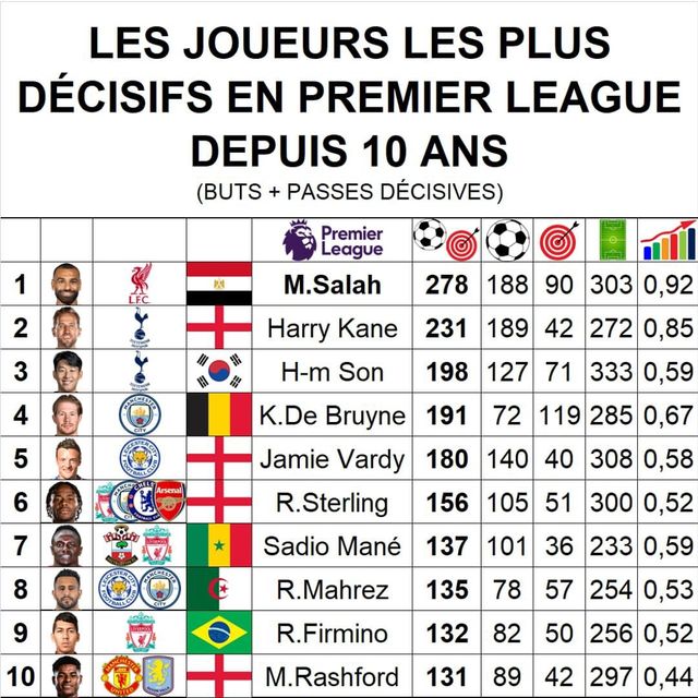 1위는 리버풀 에이스 모하메드 살라였다. 살라는 303경기에서 188골 90도움으로 총 278개의 압도적인 공격 포인트를 기록했다.