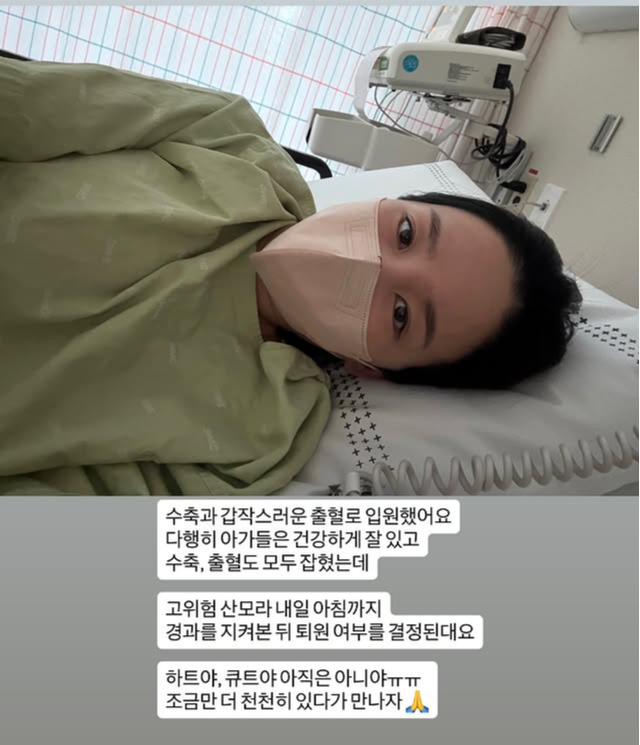 15일 초아는 자신의 SNS에 “수축과 갑작스러운 출혈로 입원했어요”라며 “다행히 아가들은 건강하게 잘 있고 수축과 출혈도 모두 잡혔는데 고위험 산모라 내일까지 경과를 지켜본다 퇴원을 결정한대요”라고 적었다.