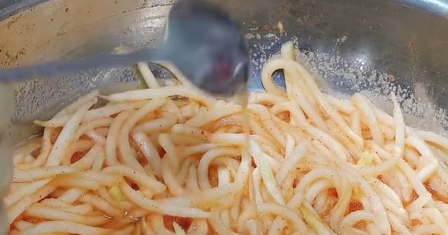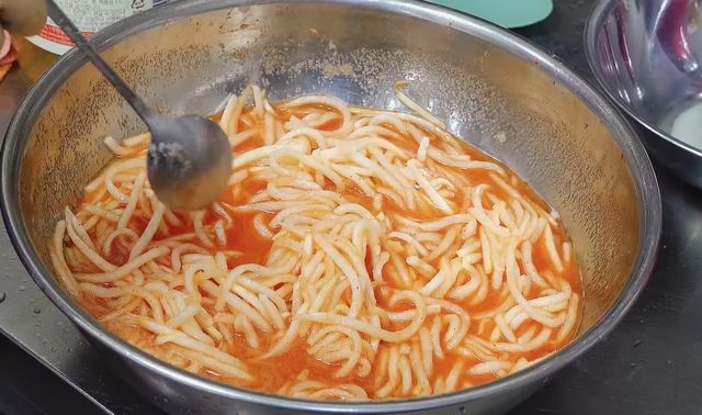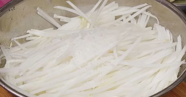 채 썬 무에는 소금을 소량 뿌려 약 10분 정도 가볍게 절인다. 이 과정에서 무 속 수분이 빠져나오며 자연스러운 국물이 형성된다. 중요한 점은 절이는 시간을 과하게 늘리지 않는 것이다. 오래 절이면 무 조직이 지나치게 무르고 탄력이 떨어진다. 절인 뒤에는 손으로 가볍게 눌러 수분을 짜되, 완전히 제거하지 않고 일부를 남겨둔다. 남겨둔 무즙이 바로 자박한 국물을 만드는 기반이 된다.