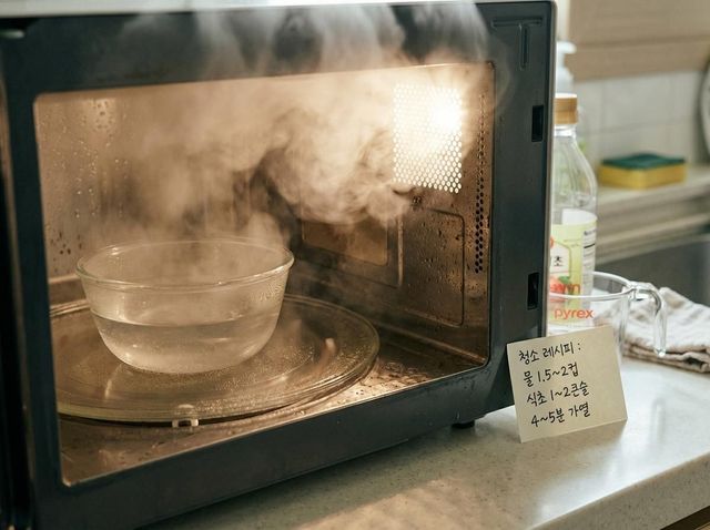 가장 많이 권장되는 방법은 식초 스팀 청소다. 내열 그릇에 물 1.5~2컵과 식초 1~2큰술을 넣고 4~5분 가열한다. 내부에 김이 가득 찬 뒤 2~3분 방치하면 눌어붙은 음식물이 불려진다. 이후 부드러운 천이나 스펀지로 닦아내면 힘을 거의 들이지 않고 기름때가 제거된다. 식초는 물에 잘 씻기고 가열 시 쉽게 휘발된다.