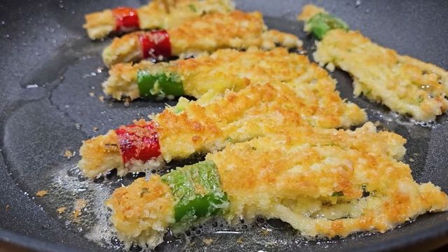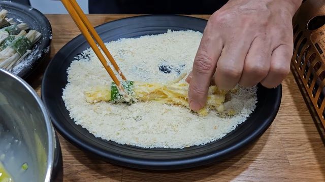밑간한 팽이버섯에 이제 밀가루를 가볍게 묻힌다. 그다음 계란물에 촉촉하게 적신 뒤, 마지막으로 빵가루를 입힌다. 이 빵가루 덕분에 팽이버섯전은 한층 더 바삭하고 고소한 식감을 갖게 된다. 프라이팬에 식용유를 넉넉히 두르고 중약불에서 부치면, 이내 고소한 냄새와 함께 노릇한 색이 올라온다. 너무 센 불은 피하고, 겉면이 바삭해질 때까지 천천히 익히는 것이 좋다.