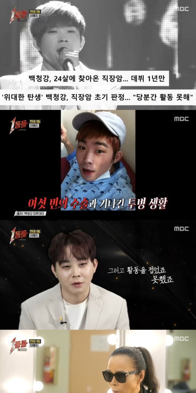 ‘1등들’에서는 ‘위대한 탄생’ 우승을 차지했던 백청강이 출연해 그동안의 근황과 가슴 아픈 사연을 공개했다. 백청강은 우승 후 데뷔 1년 만에 청천벽력 같은 직장암 판정을 받았음을 고백하며, “암 진단 후 6번의 수술을 거치며 긴 공백기를 가져야 했다. 몸이 아픈 것보다 사람들에게 잊혀 무대에 다시 서지 못할까 봐 그게 더 두려웠다”고 털어놨다.