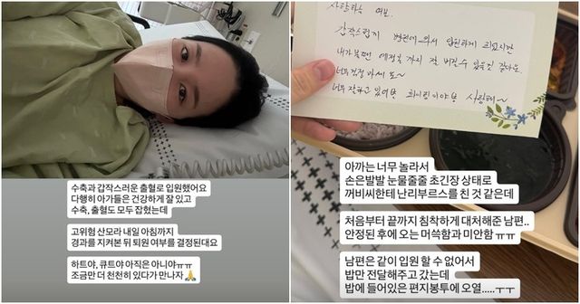 하지만 다음 날인 16일, 그는 “오늘 퇴원 실패”라며 좀 더 경과를 지켜봐야 한다는 의료진의 판단을 전했다. 병실이 부족해 보호자가 상주할 수 없는 분만장에 입원 중이라고 밝히며 “주어진 면회 10분이 너무 짧다”고 아쉬움을 드러냈다. 그럼에도 “병원에 있으니 의료진이 꼼꼼히 체크해주셔서 감사하다”며 의료진에 대한 고마움도 잊지 않았다.