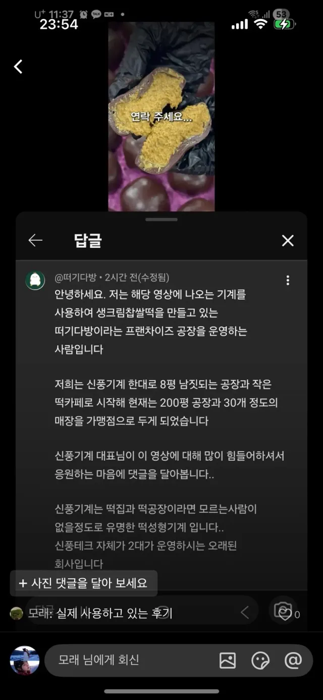 같은 기계 사용하는 다른 업체도 기계업체 응원글 올라옴