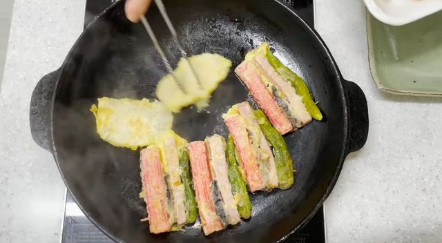 약 1~2분 정도 지나면 팬 안의 물이 대부분 증발한다. 이때 뚜껑을 열고 불을 중불로 올린다. 팬에 남아 있는 수분이 완전히 사라지면서 전의 겉면이 다시 기름에 구운 듯한 질감으로 변한다. 이미 전 자체에 기름이 배어 있기 때문에 별도의 식용유를 추가하지 않아도 표면이 노릇하게 살아난다.